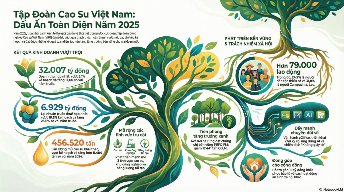 Kết quả này khẳng định Tập đoàn không chỉ hoàn thành nhiệm vụ sản xuất kinh doanh được giao mà còn đạt mục tiêu tăng trưởng 8% trong năm 2025 theo Nghị quyết của Chính phủ, thể hiện rõ vai trò doanh nghiệp nhà nước nòng cốt trong ngành cao su và nông nghiệp quy mô lớn.