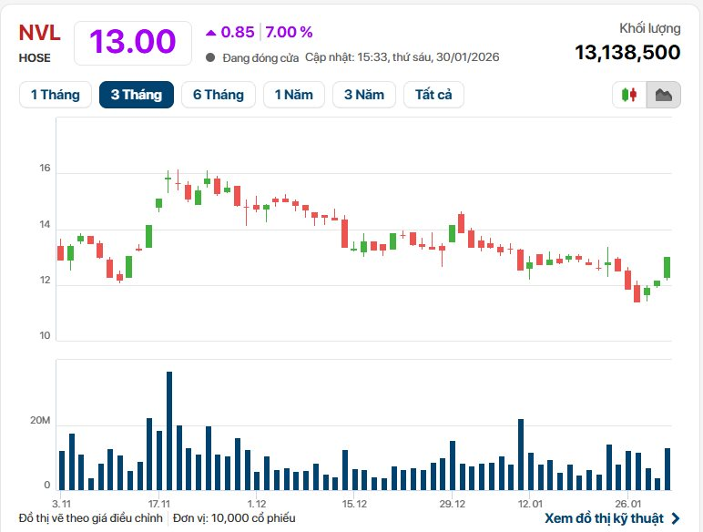 Cụ thể, kết phiên 30/1, giá cổ phiếu NVL của CTCP Tập đoàn Đầu tư Địa ốc No Va (Novaland) ở mức 13.000 đồng/cổ phiếu, tăng kịch trần 7% so với phiên trước, khối lượng cổ phiếu giao dịch khớp lệnh tăng đột biến đạt hơn 13,1 triệu đơn vị.