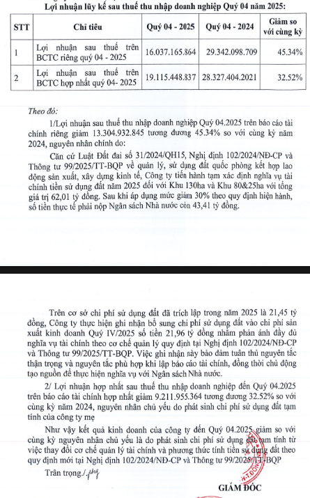 Theo văn bản giải trình của công ty, nguyên nhân chủ yếu dẫn đến sự sụt giảm này là do phát sinh chi phí sử dụng đất tạm tính của công ty mẹ. Cụ thể: