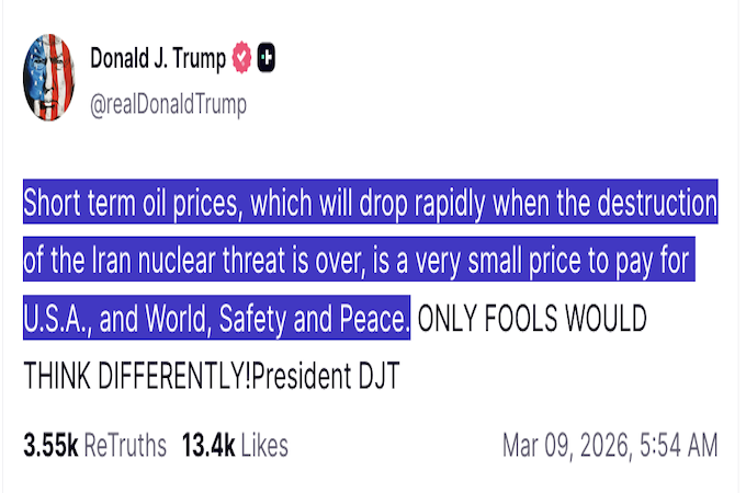 Sáng 9/3, theo giờ Việt Nam, Tổng thống Mỹ Donald Trump đã viết trên mạng xã hội Truth Social rằng: “Giá dầu trong ngắn hạn - thứ sẽ giảm rất nhanh khi mối đe dọa hạt nhân từ Iran bị loại bỏ - chỉ là cái giá rất nhỏ phải trả cho sự an toàn và hòa bình của nước Mỹ và của thế giới”.
