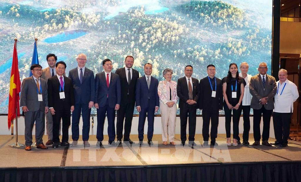 Phó Chủ tịch UBND Thành phố Hồ Chí Minh Hoàng Nguyên Dinh, Bộ trưởng Ngoại giao Estonia Margus Tsahkn, Đại sứ Estonia tại Trung Quốc kiêm nhiệm Việt Nam Hannes Hanso cùng các Lãnh sự danh dự Estonia khu vực châu Á dự sự kiện. Ảnh: Trung Tuyến - TTXVN